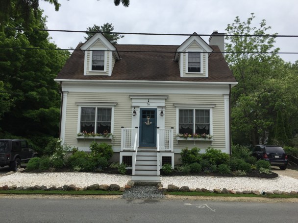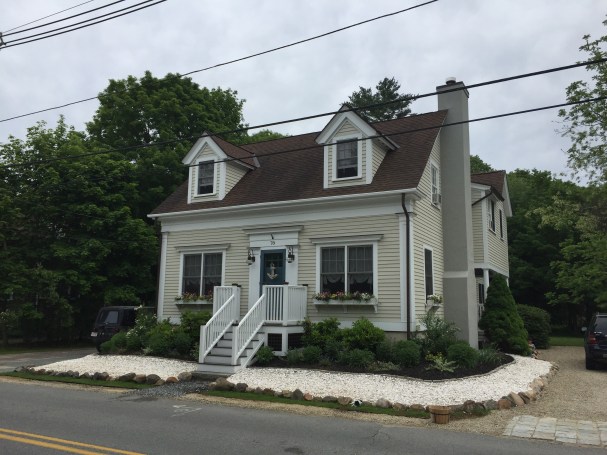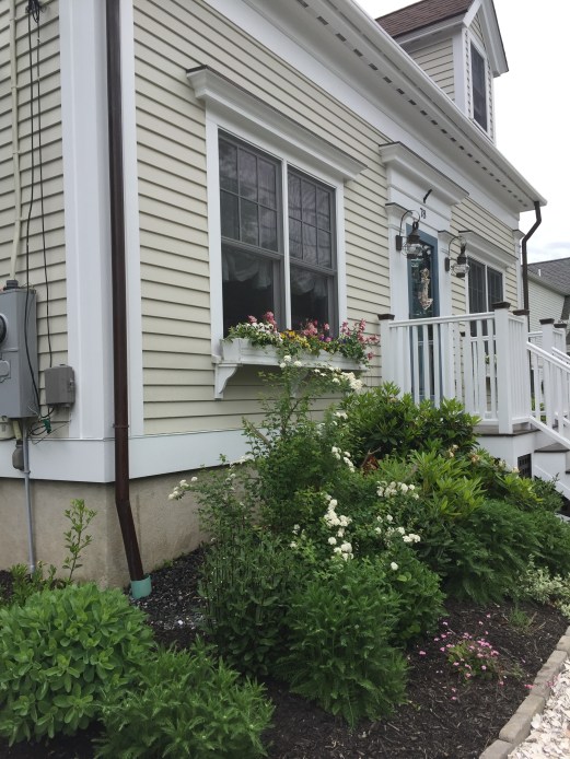 We brought in crushed sea shells to help break up the land and planting beds in the front along with gray pavers to create the divide and add interest. We kept the Rhododendrons and gave them a hardy trim. Planted many different perennials for color from spring through fall. Added flower boxes for that additional charm and to pull the color up.