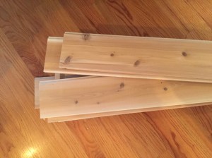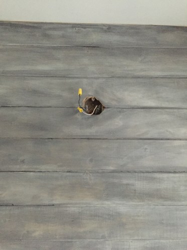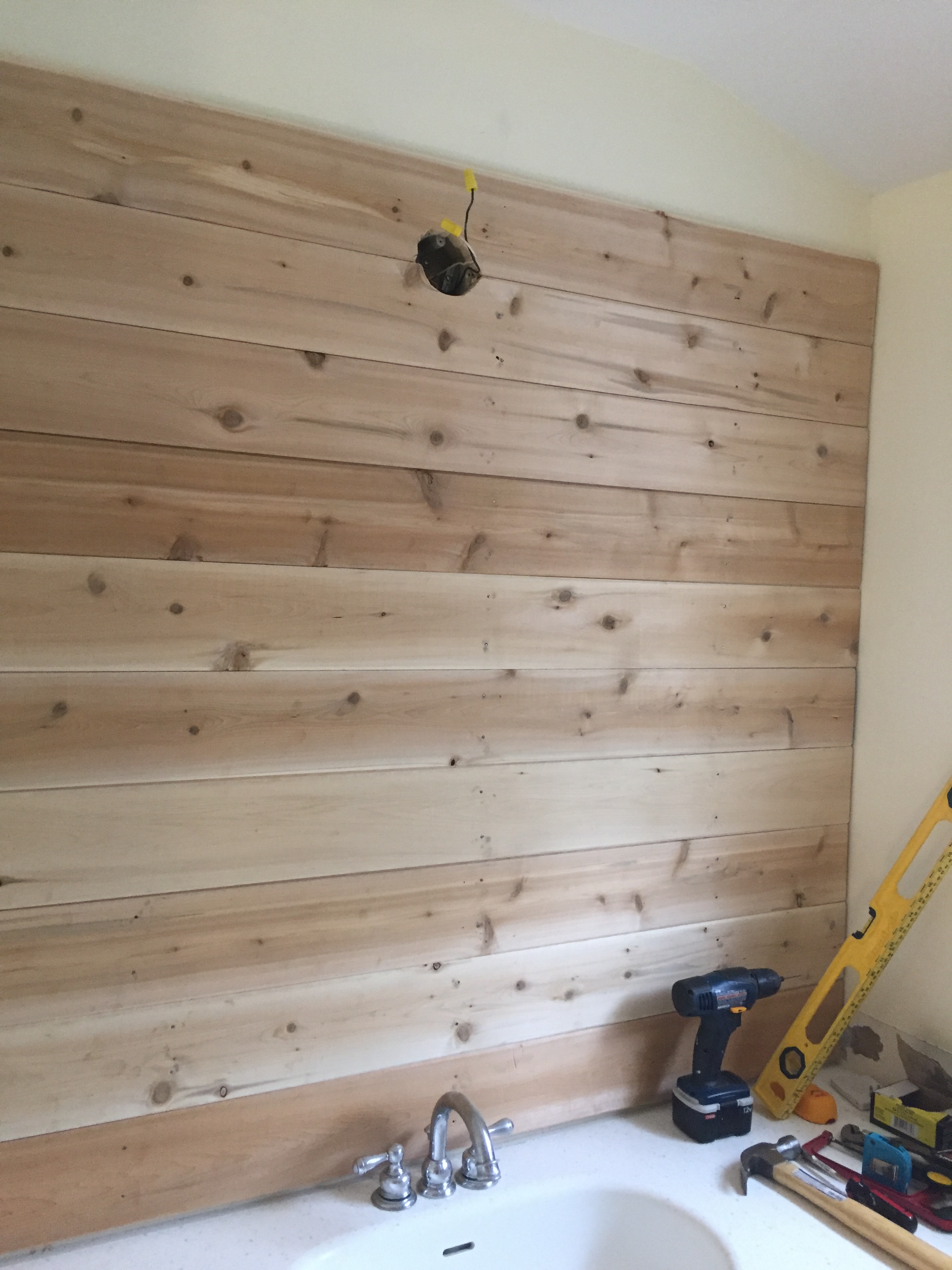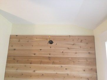 We measured out the space and bought tongue and groove planks cut to size at home depot. We then marked the wall for stud locations and nailed in each piece to the wall. The top of the ceiling was angled so it was a bit of a bear to get that last board just right. The wood planer came in handy for this task and my husband patiently sized it for the tricky space.