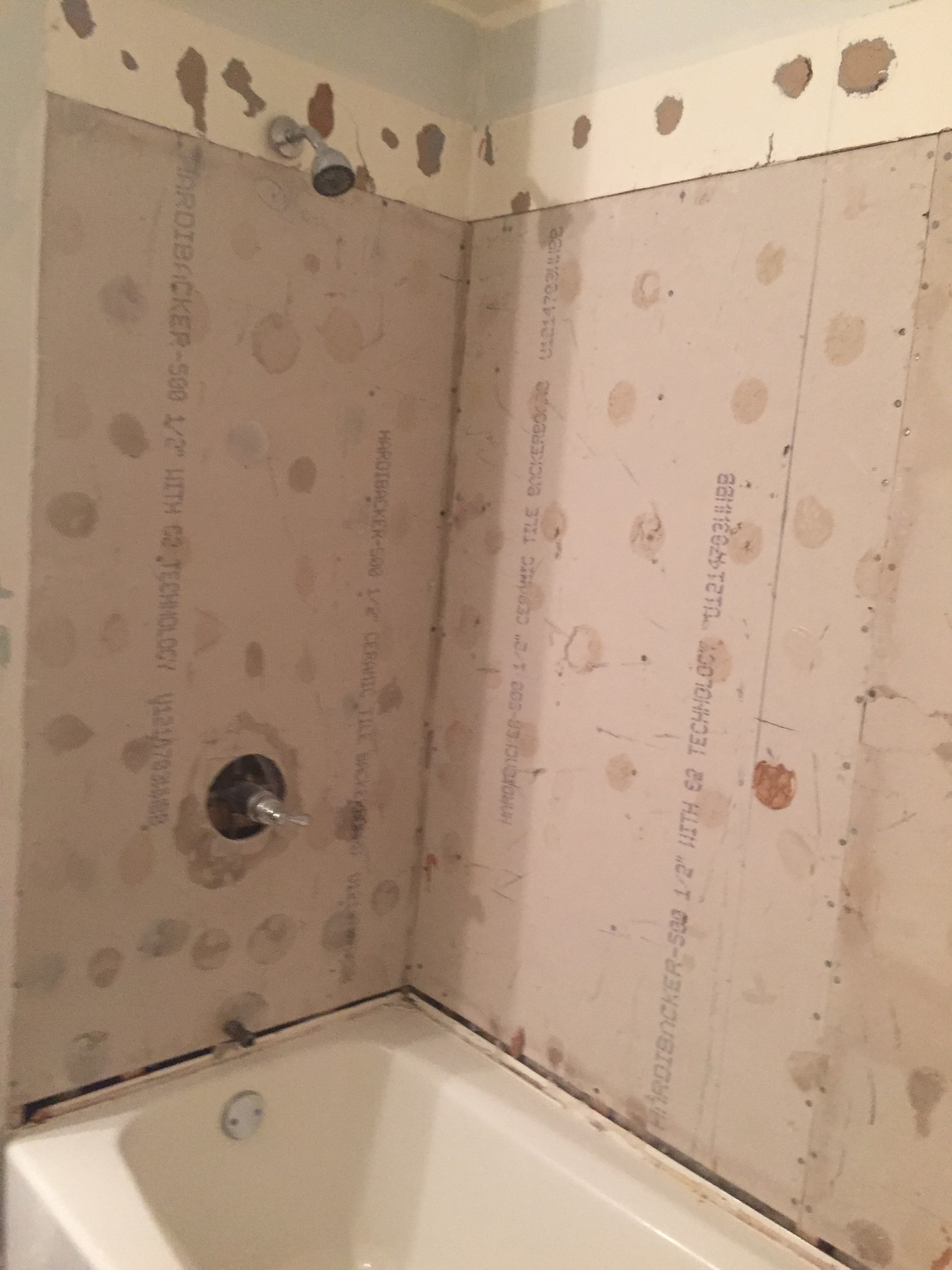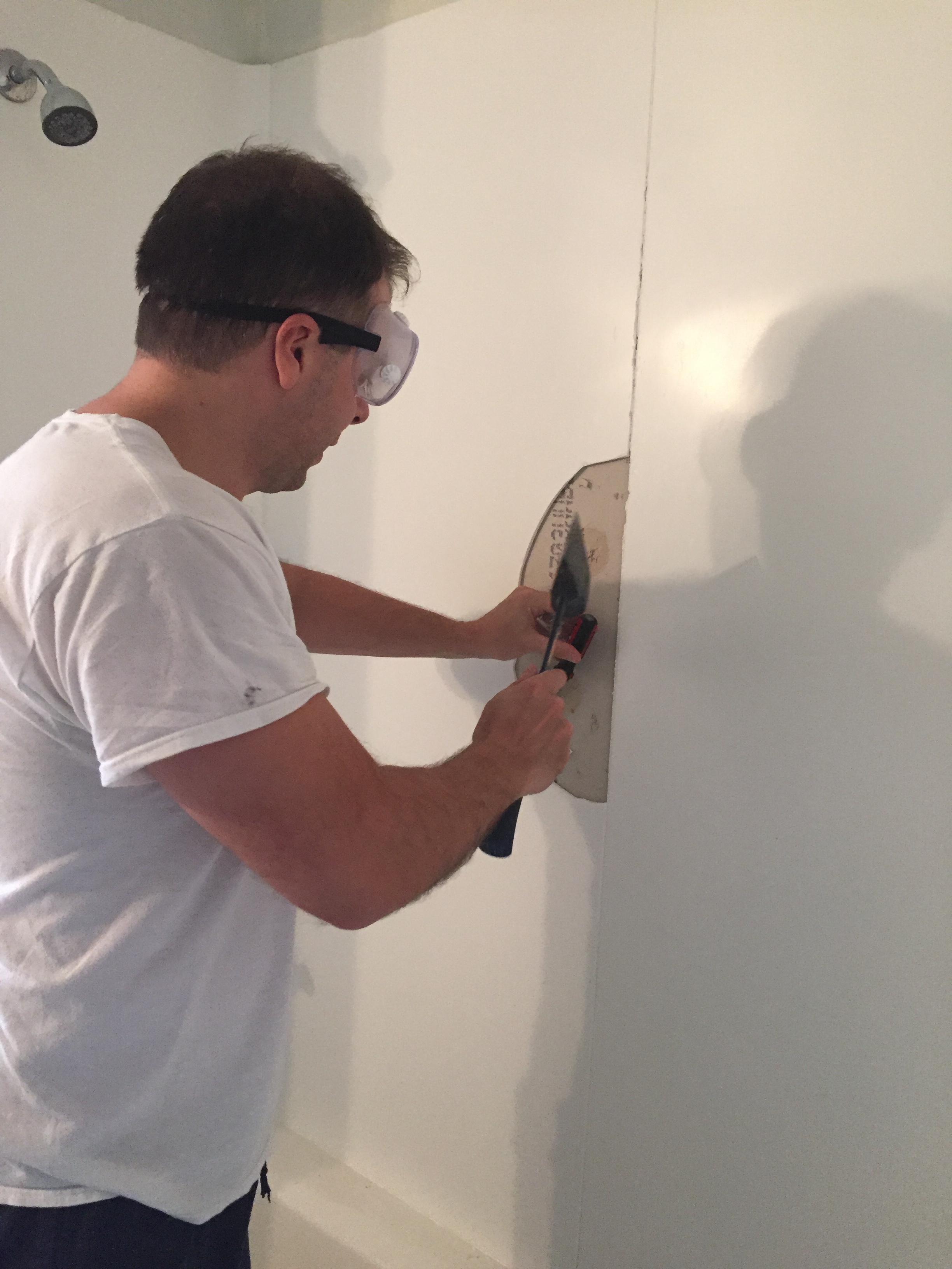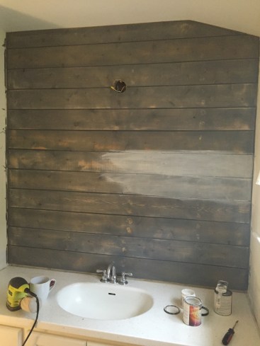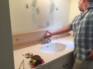 We had planned on saving the vanity and sink so we carefully removed the tile backsplash for reuse and the rest we got rid of and prepped the space for the shiplap feature wall!