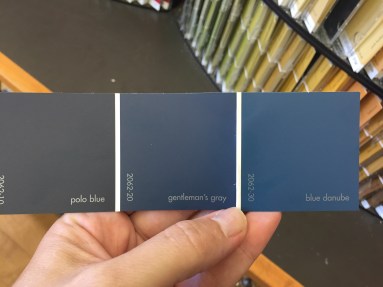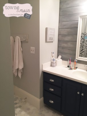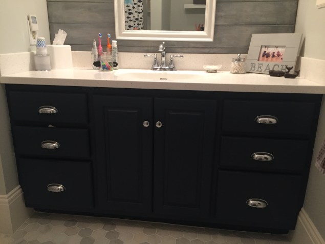 Vanity paint – Benjamin Moore gentleman’s gray – which is a nice dark blue and love how the chrome handles pop.