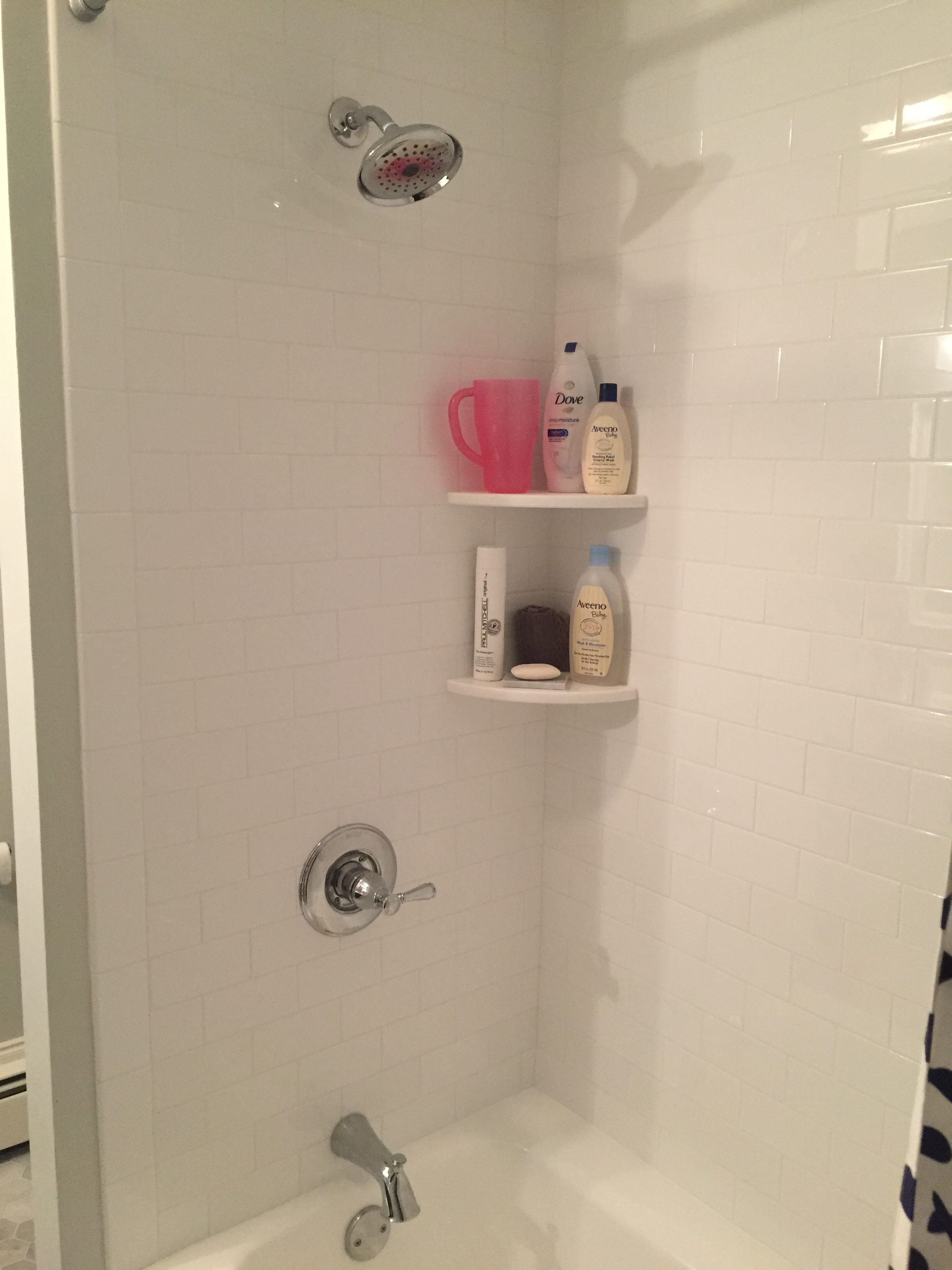 For the shower surround we did a clean white subway tile with white grout. http://www.homedepot.com/p/Jeffrey-Court-Fresh-White-3-in-x-6-in-Ceramic-Field-Wall-Tile-12-5-sq-ft-case-96012/207097704. I had to go to a custom tile shop to get the corner shelves in a white marble.